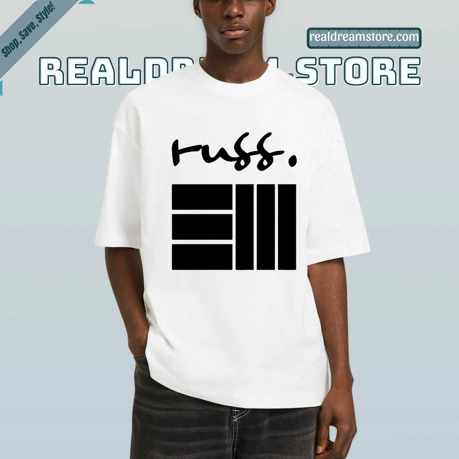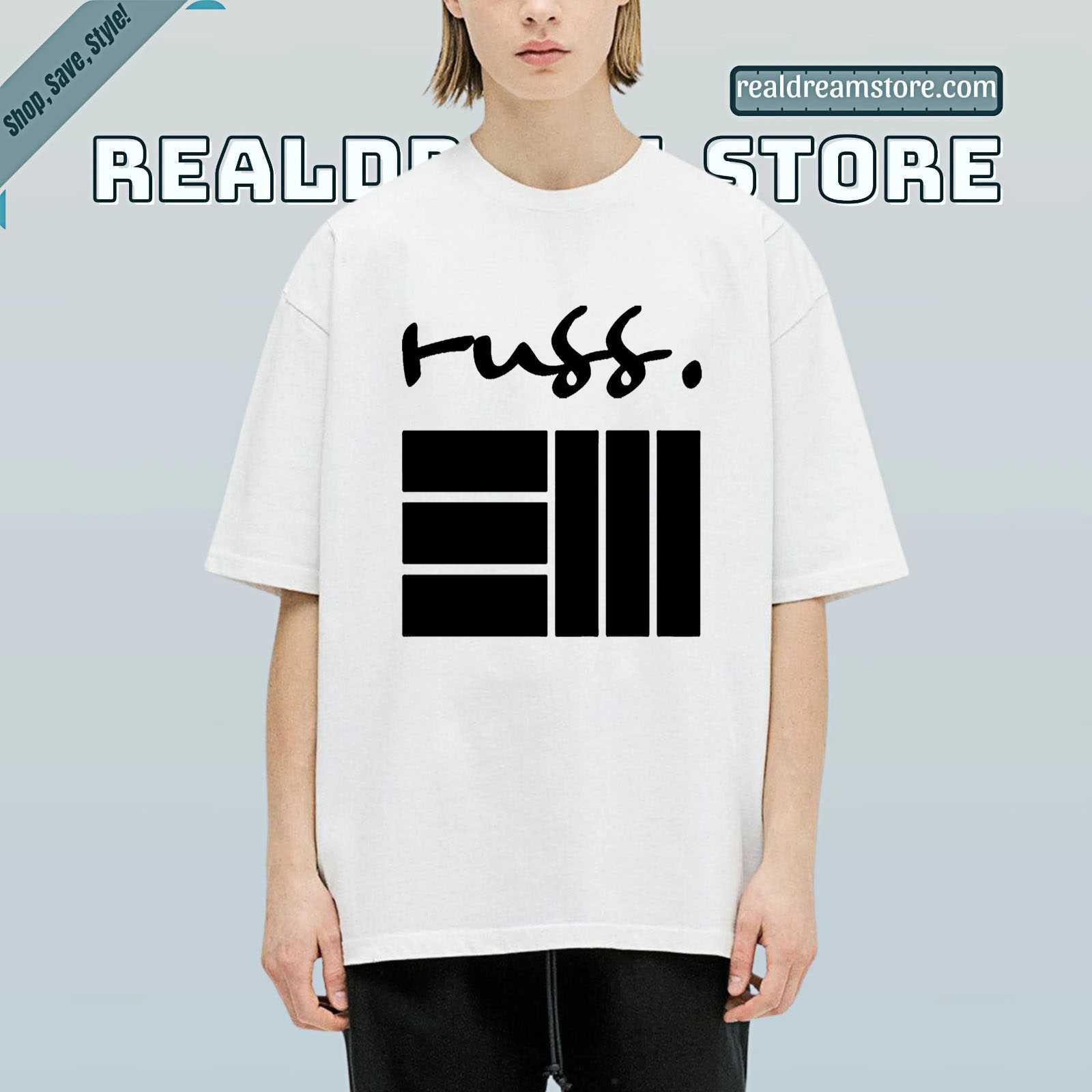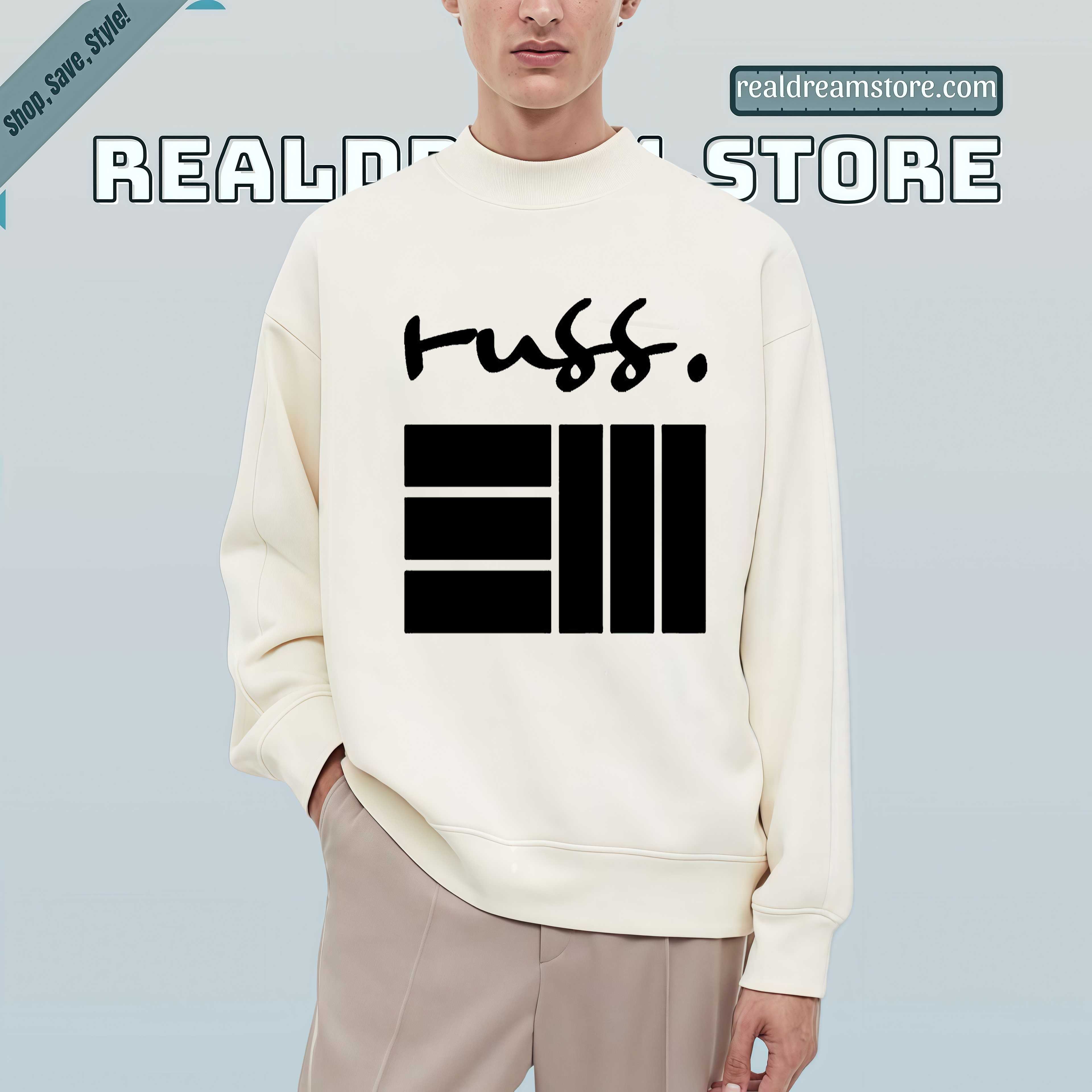 Product Information "Russ Logo Graphic Tee - Signature Handwritten Script & Bars Design Shirt"